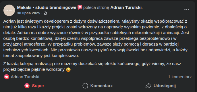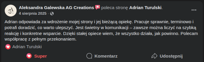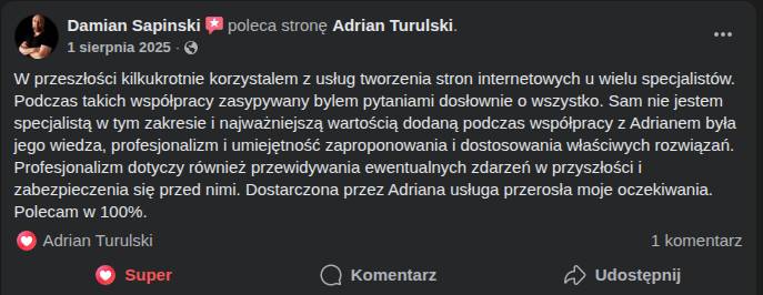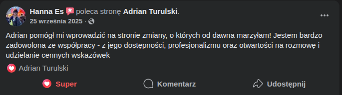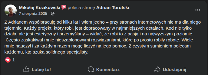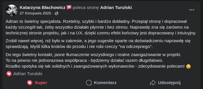 To są prawdziwe rekomendacje od właścicieli firm, którzy powierzali mi swoje strony i problemy do rozwiązania. Na początek zebrałem te, które najlepiej pokazują szybką reakcję, trafne rozpoznanie problemu i konkretną pomoc.