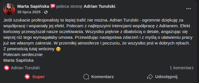 Na swoją pracę daję 12 miesięcy gwarancji. Jeśli po mojej stronie coś wymaga poprawki, wracam do tematu bez przeciągania.